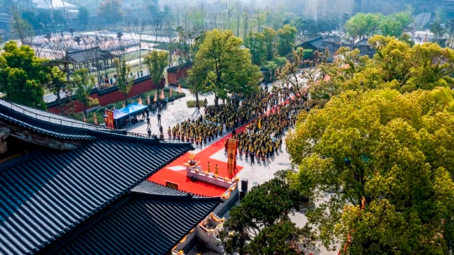 “清明恭祭钱王”仪式共分撞钟击鼓、敬奉供品、净手上香、行施拜礼、恭读祭文、颂歌钱王、乐舞敬拜、诵读家训、敬献花篮等仪程。