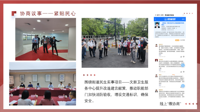 毛洁敏组长从“谁来议”、“在哪议”、“怎么议”三个问题展开,详细介绍了民生议事堂的参与主体与协商议事的工作流程。通过“围绕中心”、“紧贴民心”、“突出重心”三个方面汇报了2022年文新街道民生议事堂的工作成效。